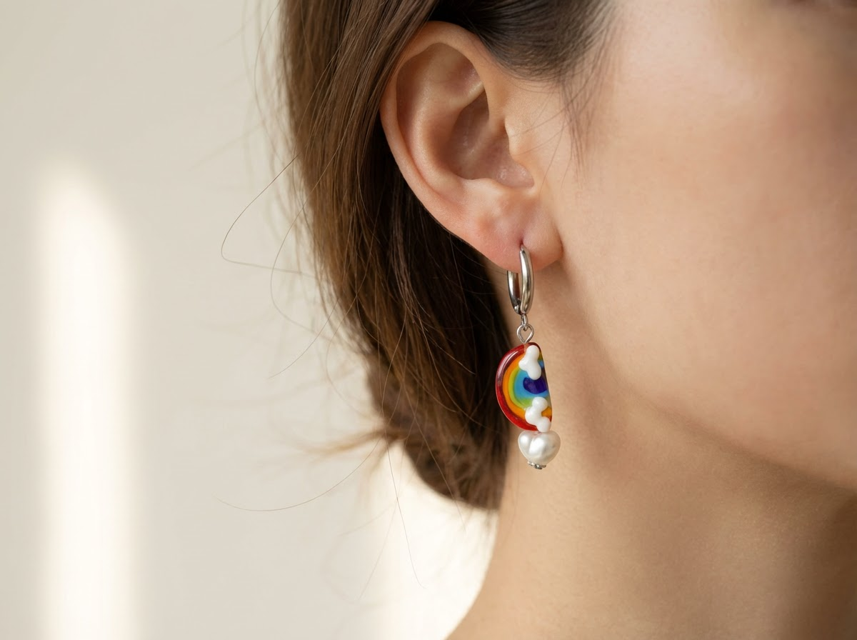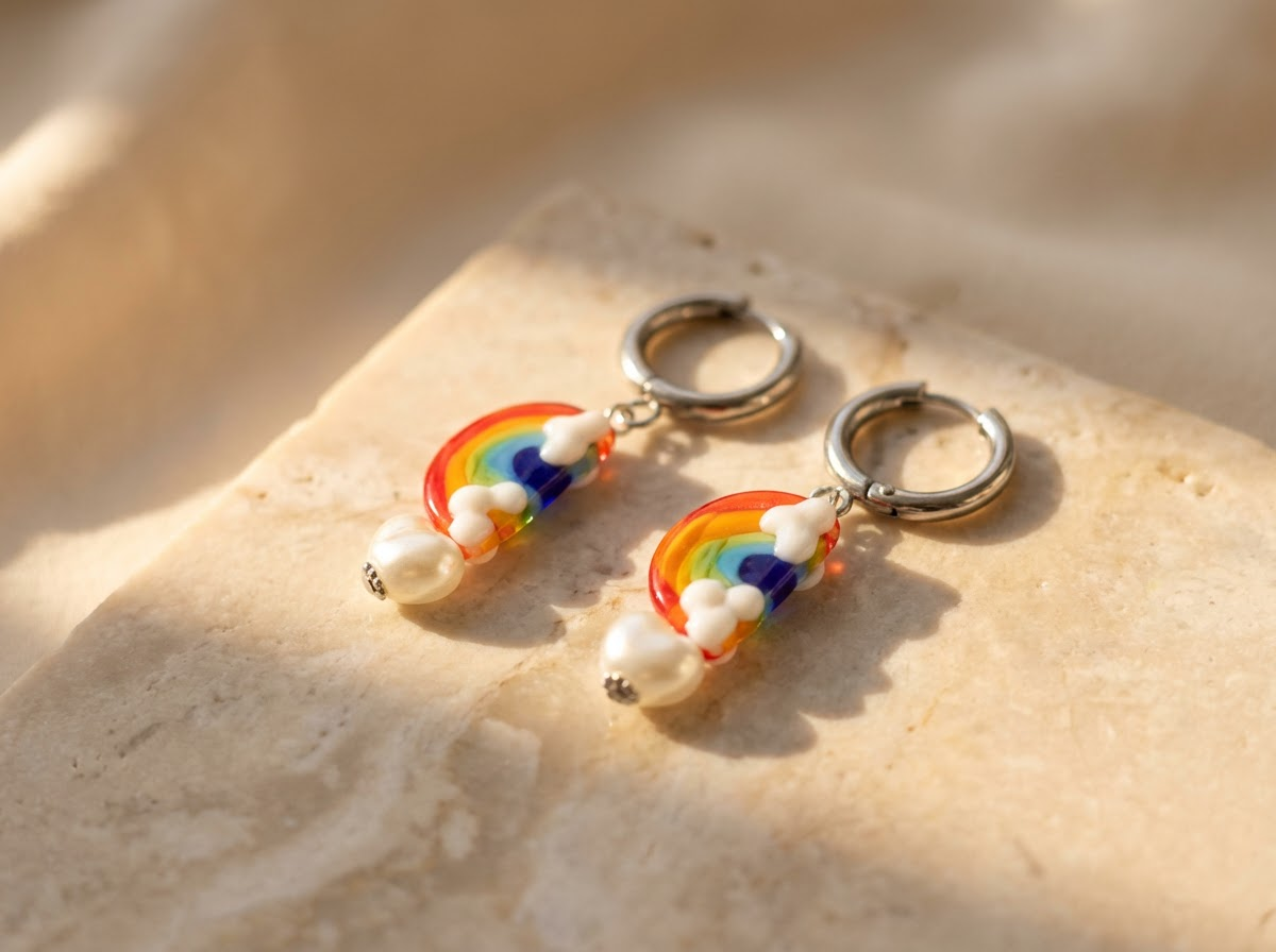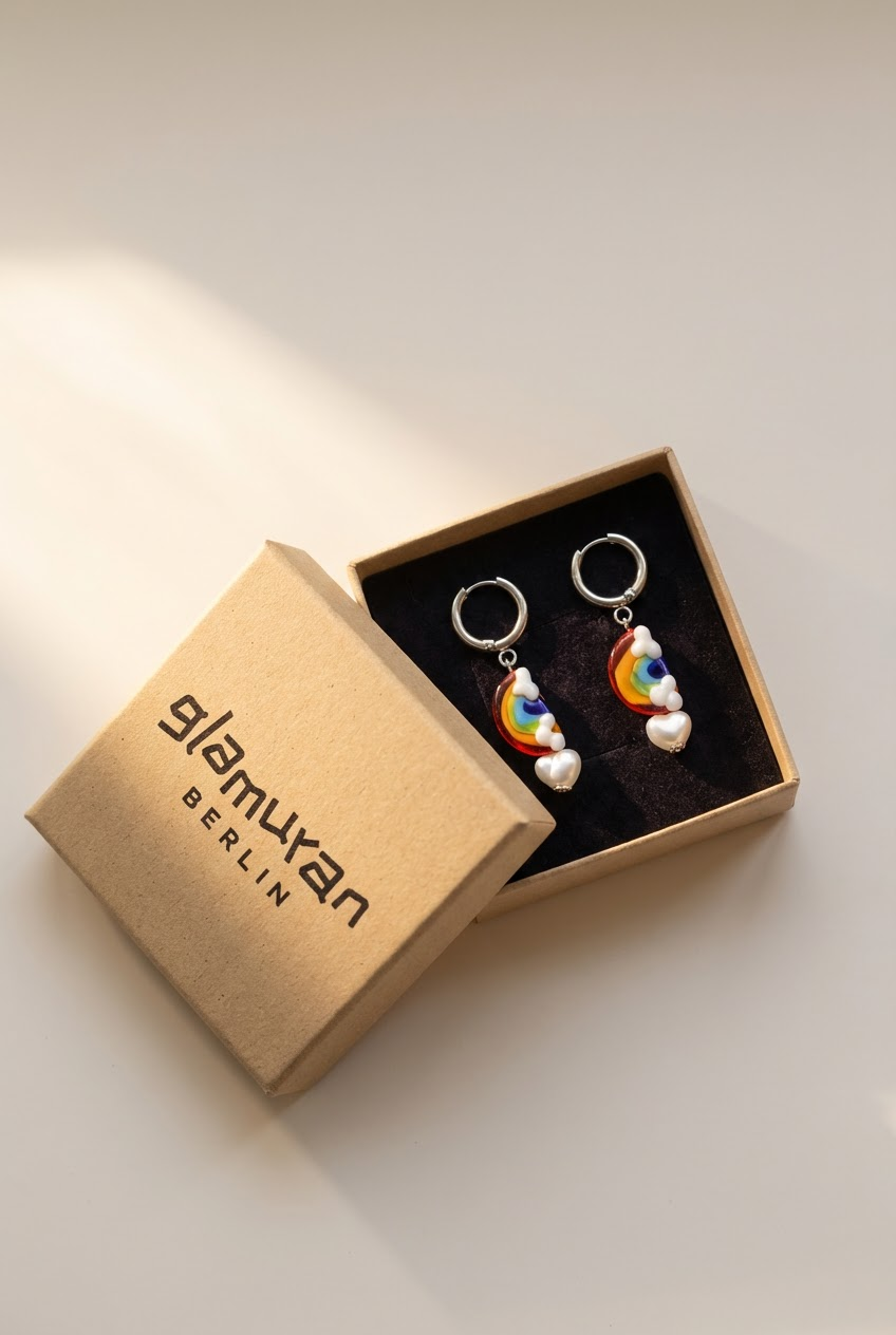 Mit handgefertigten Glasperlen im Regenbogen-Look, fluffigen Wolkendetails und einem zarten Perlentropfen. Die Anhänger bestehen aus Murano-Glas in Lampwork-Technik – Farben und Formen sind im Glas eingeschmolzen, nicht bemalt. Die Creolen bestehen aus nickelfreiem, antiallergenem Edelstahl – perfekt für empfindliche Ohren.
