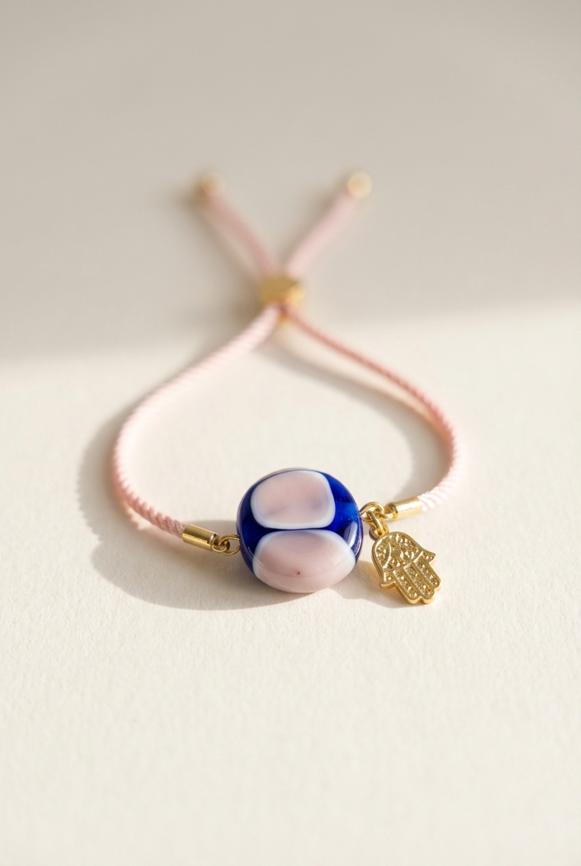 Dieses handgefertigte Armband verbindet stilvolle Eleganz mit spiritueller Bedeutung. Die Murano-Glasperle in sanften Rosa- und Blautönen wird von einem goldfarbenen Hamsa-Anhänger begleitet – einem Symbol für Schutz, Stärke und Glück.